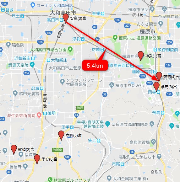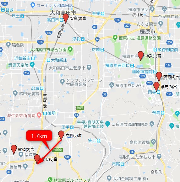 サヌ(神武)からオホヤマトタラシヒコクニオシヒト(孝安)までの各「天皇」の「宮」の位置は、『古事記』[2]によれば次のようになる。